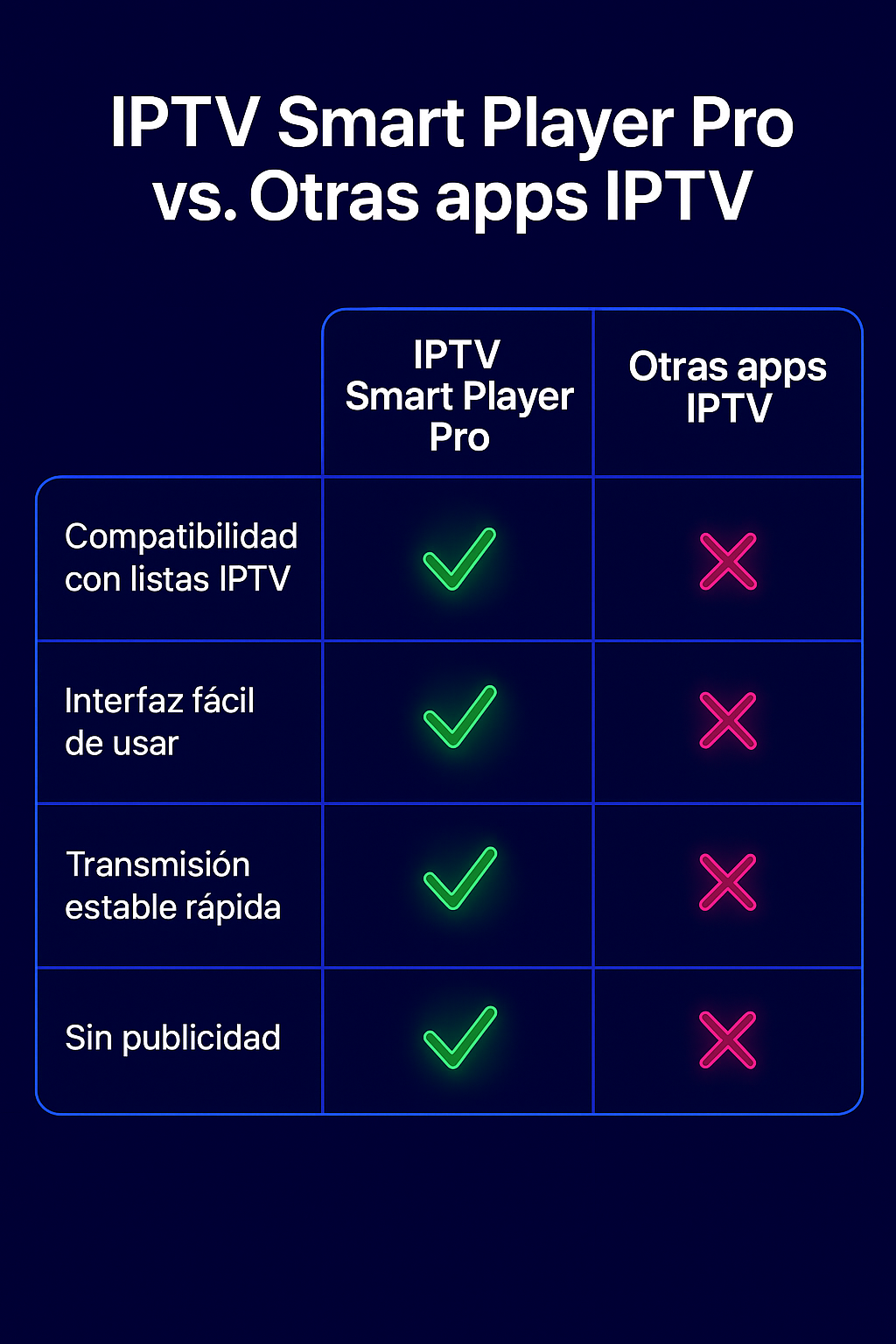 Si estás buscando una aplicación IPTV estable, elegante y potente, IPTV Smart Player Pro es la respuesta. Olvídate de aplicaciones llenas de errores o con anuncios molestos, y cambia a una experiencia premium.