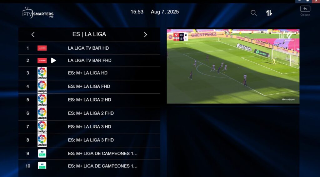 Una vez cargada la lista, verás los canales organizados por categorías. Puedes filtrar, buscar, crear favoritos, activar el EPG y comenzar a ver tus canales favoritos en HD.